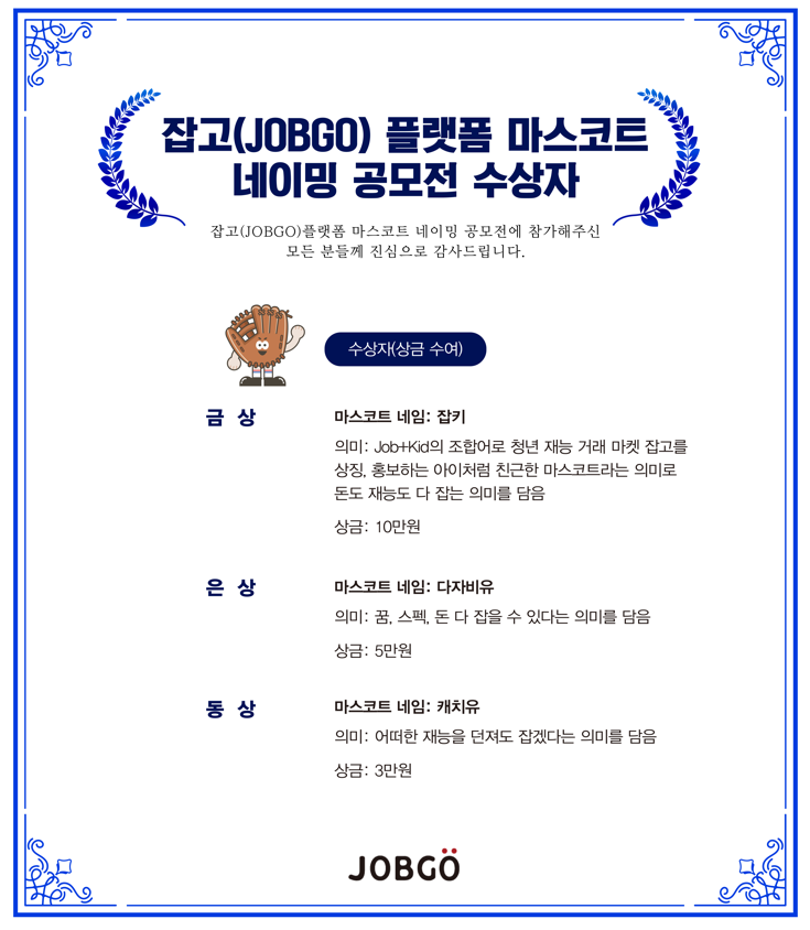 잡고(JOBGO) 플랫폼 마스코트 네이밍 공모전 수상자 발표