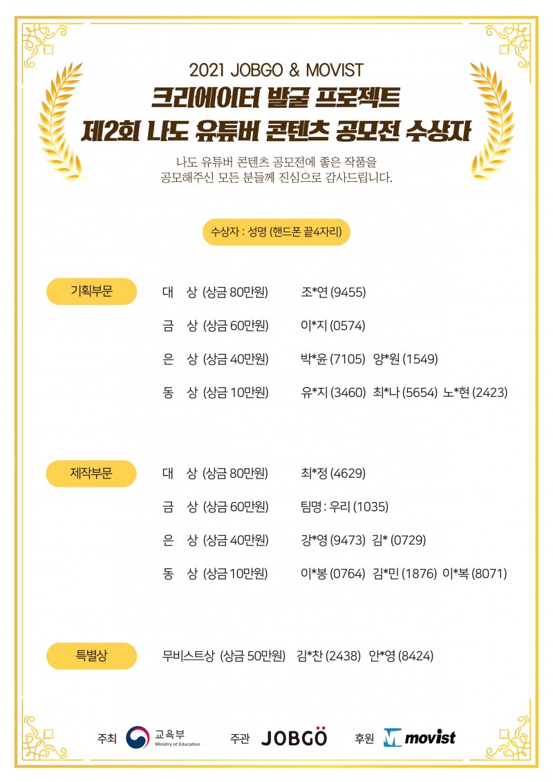 2021 JOBGO&MOVIST 제2회 나도 유튜버 콘텐츠 공모전 수상자 발표